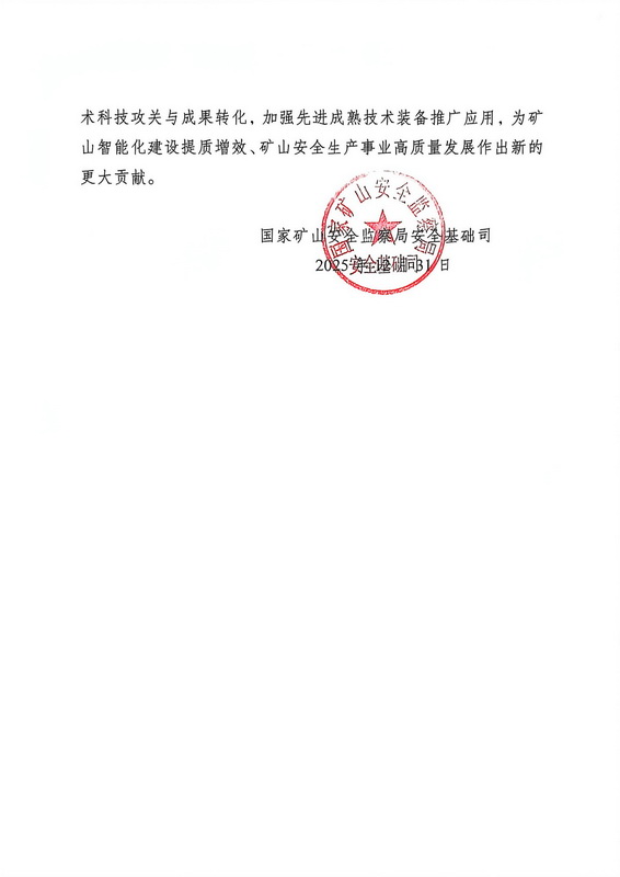 信中指出,矿冶集团作为第二届矿山智能化建设专家委员会主任单位,在矿山智能化政策标准制定、专家委员会机制运行、安全技术支撑、关键技术攻关等方面给予了大力支持,特别是牵头完成了《金属非金属矿山智能化建设指南》编制,填补了我国金属非金属矿山智能化建设顶层设计的空白,为全国矿山智能化建设工作作出了积极贡献。
