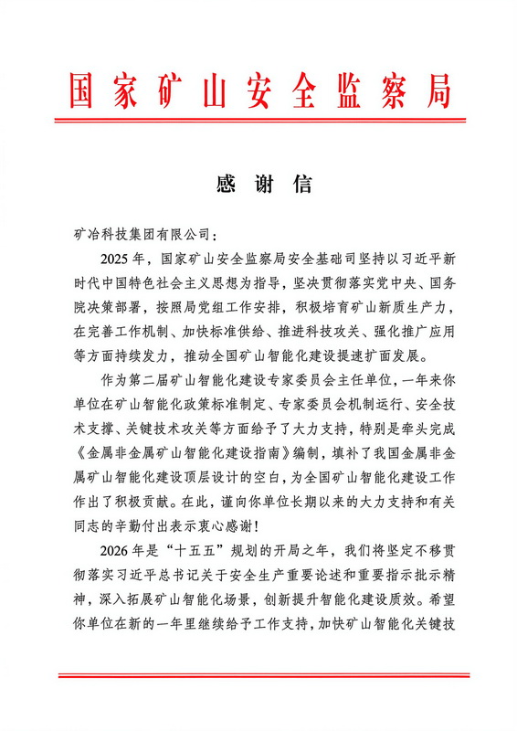 近日,国家矿山安全监察局安全基础司向矿冶集团发来感谢信,对矿冶集团长期以来的大力支持和有关同志的辛勤付出表示衷心感谢。